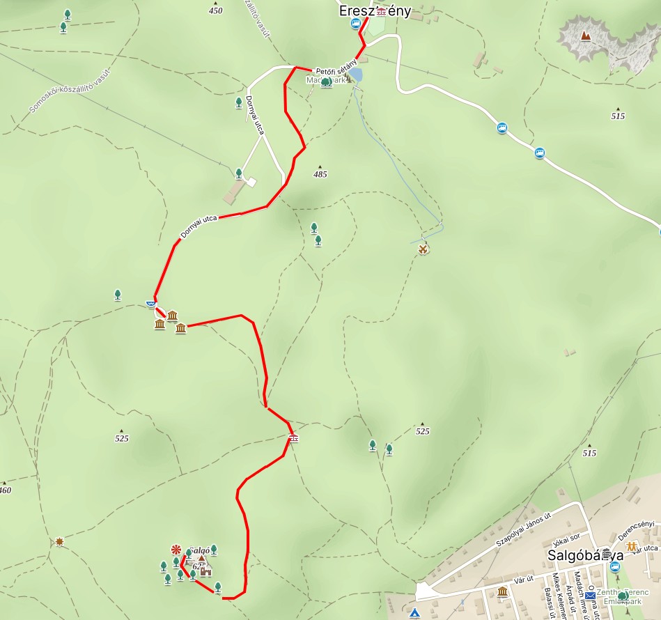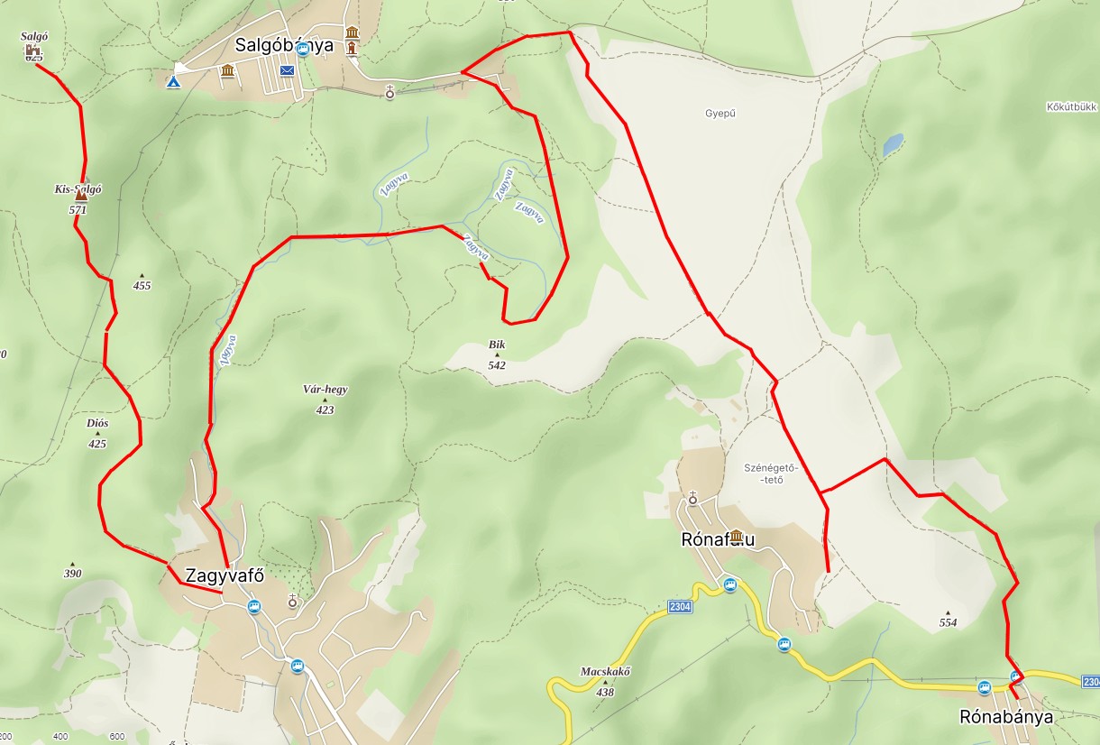 Eresztvényből a Salgóbánya felé vezető műutat keresztezve a Hotel Salgó felé indulsz tovább. A piros jelzés a Dornyai ház felé vezető utat balra elhagyja, s egy rövid szakaszon az erdőben kanyarog. Kisvártatva azonban visszatér az útra, s a felújított, üzemelő Dornyai házig azon haladsz tovább. A ház után, azt megkerülve a sárga jelzést követed, mígnem egy tisztáson ( szélén esőbeálló) a jobbra, meredeken felfelé haladó piros háromszög jelzésen éred el Salgó várát. A várból leereszkedsz a Boszorkánykő sziklatömbje alá, majd arra is felmászol. Innen a szikla túlsó felén, Zagyvaróna irányába ereszkedsz le.